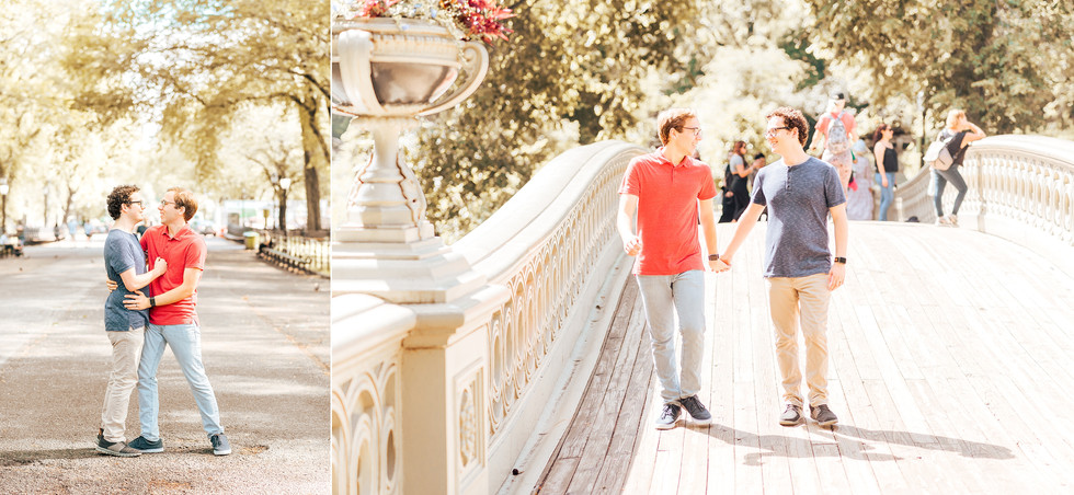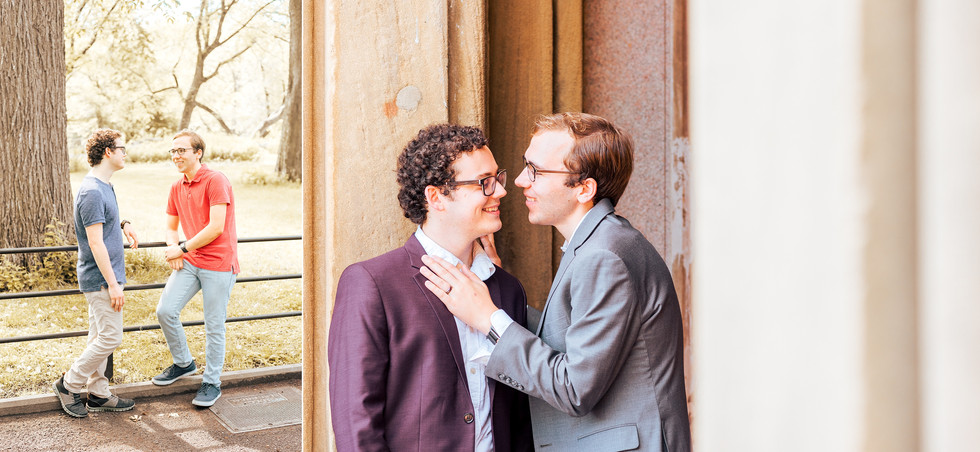 Their Session: My husband and I ventured over to NYC. We met up with Austin and Aaron early one warm summer morning at the Bethesda fountain and terrace in Central Park. They were both so well dressed in grey and purple suits that complimented each other nicely. We toured around the park for a while as we got to know each other. As temperatures rose, Austin and Aaron changed into more casual outfits which was defffff more fitting for skipping around! Did you know they have public restrooms right by the fountain?! I'd love to share some of my favorite photos from their Central Park engagement session, but first, more about their story!